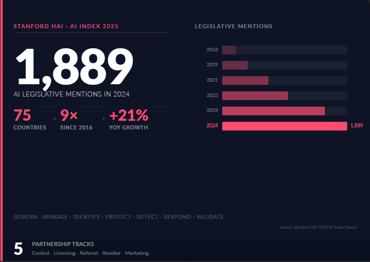 1,889 AI legislative mentions across 75 countries in one year. Customers face compliance pressure from every direction, in every market.